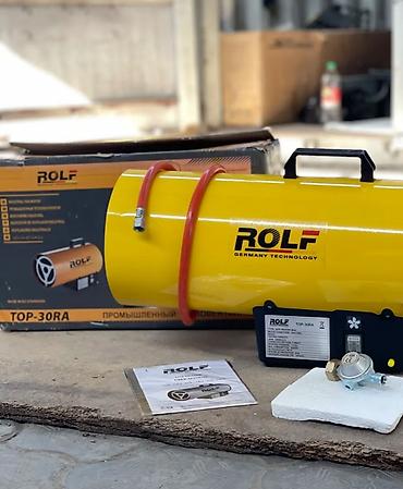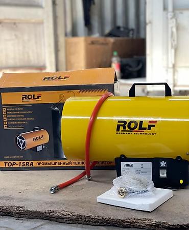 Промышленный газовый обогреватель ROLF в желтом металлическом корпусе, предназначенный для обогрева помещений. Модель оснащена удобной ручкой для переноски, а также шлангом с редуктором для подключения к газовому баллону. Доступны различные модели по мощности: TOP-10RA (10 кВт), TOP-15RA (15 кВт) и TOP-30RA (30 кВт), что позволяет выбрать подходящий вариант для разных объемов помещений. Обогреватель работает от сети 220-240В и использует сжиженный газ (пропан).