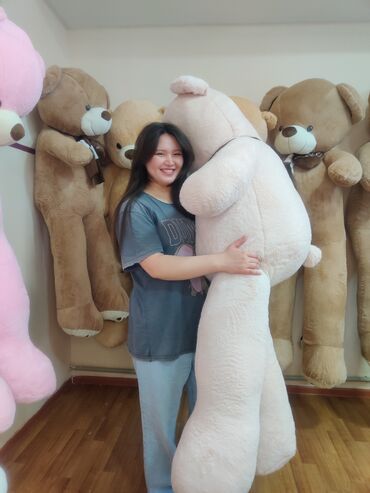 Большие плюшевые медведи - Мягкие игрушки-мишки увеличенного размера — рост примерно от 140 до 170 см (по фото видно, что выше пояса взрослого человека). - Разные цвета: молочно‑белый, кремовый, б...