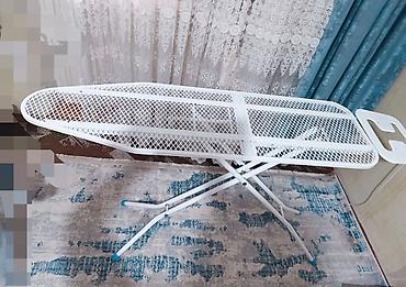 Гладильная доска с металлической сетчатой поверхностью и подставкой под утюг.