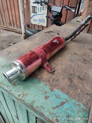 Комплектация по фото: глушитель в сборе с входной трубой и крепёжной скобой. Цвет — красный с металлическими торцами.