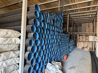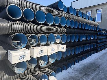 Двуслойные гофрированные трубы из ПНД (наружный слой — чёрный, внутренний — голубой гладкий). Назначение: наружные безнапорные сети канализации и дренажа, ливневая канализация, кабельная защита, лотки и водоотводы.