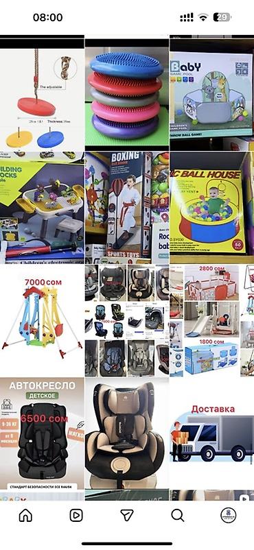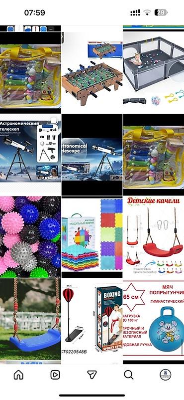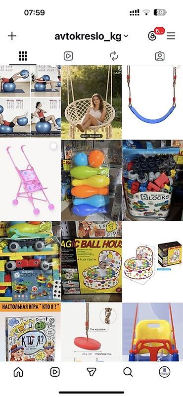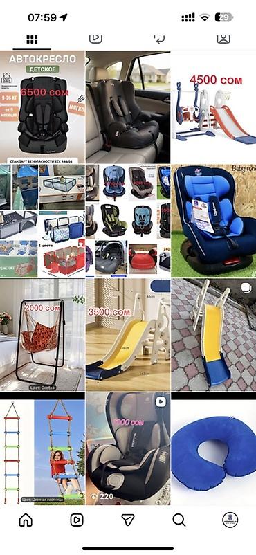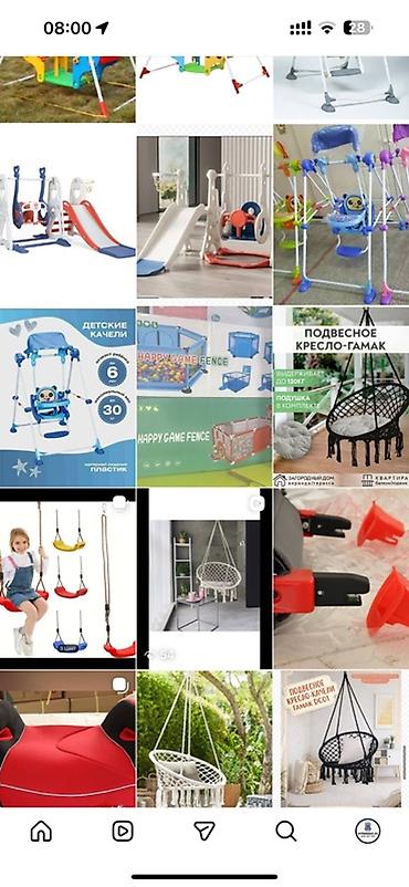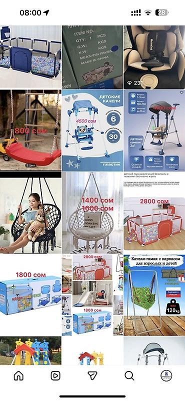 Дополнительно в ассортименте: детские качели, горки, игровые манежи, подвесные кресла-гамаки и другие товары для детей (на отдельных фото указаны цены 4500 сом, 3500 сом, 2800 сом, 2000 сом, 1800 сом и др.).