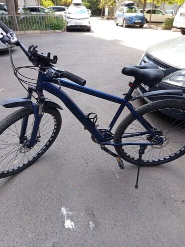 Подходит для города и лёгкого бездорожья: уверенное торможение, мягкая вилка и комфортная посадка. Цвет — глубокий тёмно‑синий с чёрными элементами.