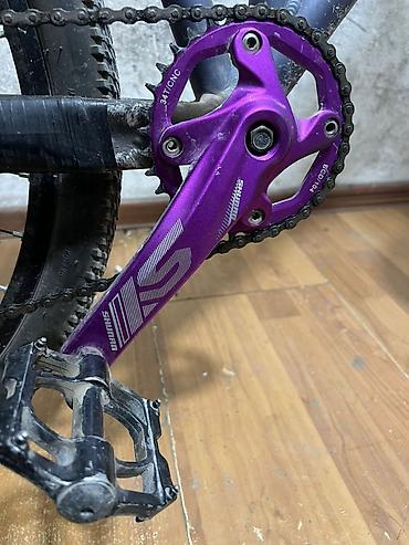 - Синглспид спереди — фиолетовая система Shimano с узко‑широкой звёздой 34T (BCD 104).