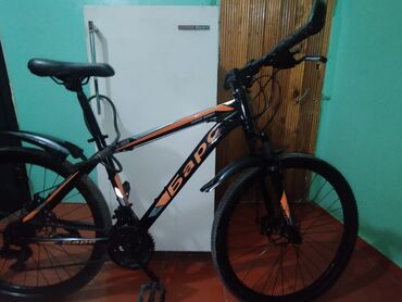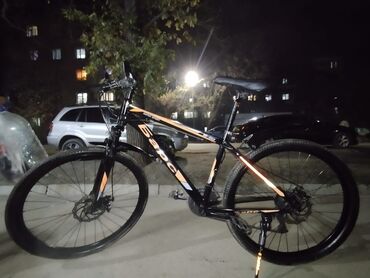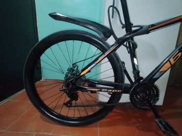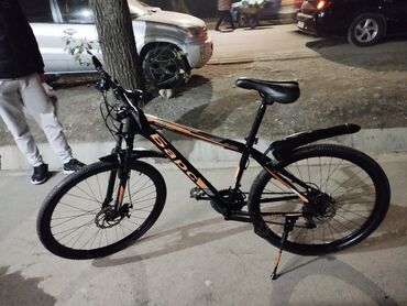 - Рама: алюминий, геометрия хардтейл, тросики проложены снаружи. Цвет: черный с оранжевыми вставками и светоотражающими элементами.