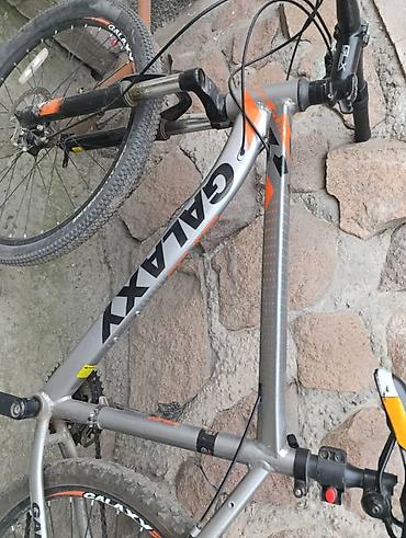 Цвет: серый с черно‑оранжевыми акцентами и крупной надписью GALAXY на раме и ободах. Подходит для поездок по городу и легкого бездорожья.