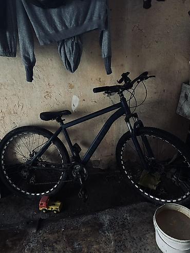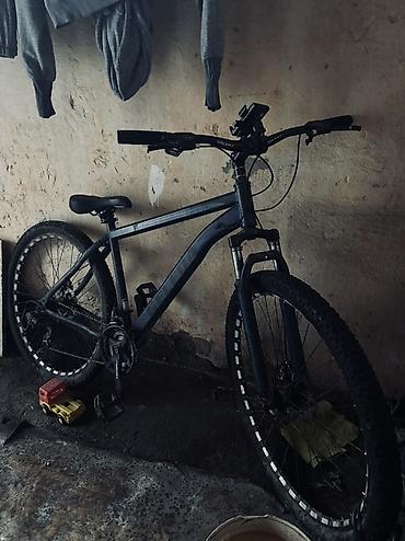 Горный велосипед (хардтейл), алюминиевая рама. Размер рамы – средний (подросток/взрослый среднего роста). Колеса с широкими покрышками для бездорожья, обода с светоотражающими метками. Передняя амортизационная вилка. Тормоза — механические дисковые спереди и сзади. Переключение передач — кассета с многоскоростной трансмиссией, задний переключатель с защитой. Прямой руль с выносом, установлено крепление под смартфон/навигатор. Комфортное седло, подседельный штырь с быстрой регулировкой. Платформенные педали, держатель для бутылки на раме. Цвет — темно-синий/графит. Отлично подходит для городских поездок и легкого офф-роуда.