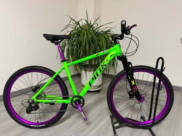 Горный велосипед с контрастными цветами рамы и колес. Доступны варианты с ярко-оранжевой, лаймово-зеленой и небесно-голубой рамой, дополненные фиолетовыми ободами колес. Оснащен передней амортизационной вилкой и дисковыми тормозами для комфортного и безопасного катания. Подходит для активного отдыха и преодоления различных маршрутов.