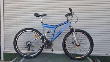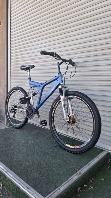 Горный велосипед с полной подвеской (двухподвес) - Рама: алюминиевая, размер ориентировочно M, цвет сине‑серый. Задний амортизатор пружинный. - Вилка: пружинно‑эластомерная с ходом, регулировка пр...