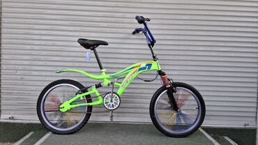 Горный велосипед с полной амортизацией, выполненный в ярко-зеленом цвете, предназначен для комфортного катания как по городским улицам, так и по пересеченной местности. Оснащен передним и задним амортизаторами, которые обеспечивают плавность хода и поглощают удары при движении по неровностям. Колеса имеют эффектные разноцветные спицы, что придает велосипеду уникальный внешний вид. Синее руль и черное сиденье дополняют общий дизайн. Подходит для активного отдыха и ежедневных поездок.