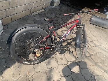 Фэтбайк AICAN? (надпись на раме «AICAR…»), черно‑красная рама. Характеристики и оснащение: - Формат: хардтейл для бездорожья с сверхширокими покрышками. - Колеса: 26" фэт, широкие обода и покрышки...