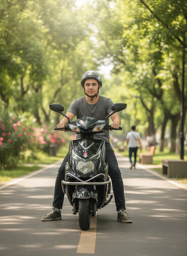 Подходит для городских поездок и пригородных маршрутов, комфортен для водителя и пассажира, есть дополнительное место для хранения в кофре. Черный глянцевый пластик, динамичный внешний вид.