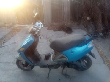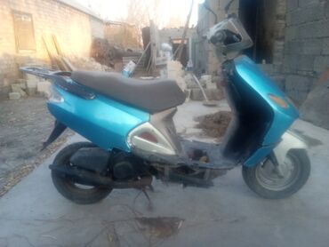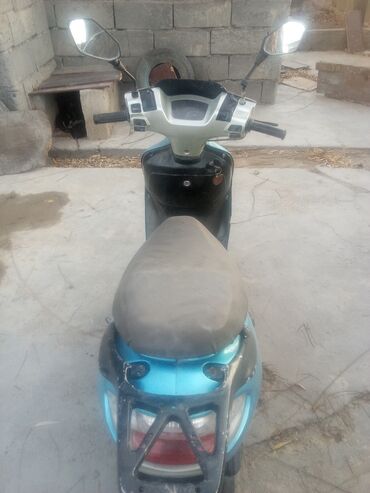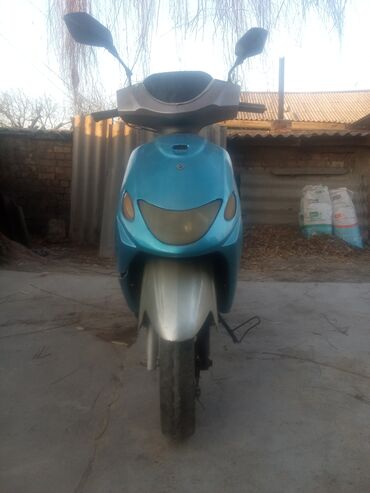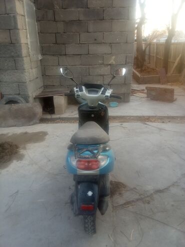 Скутер городской, синего цвета, с задним багажным кофром-каркасом и парой зеркал заднего вида. Компактный пластик кузова с интегрированными передними указателями поворота, широкое сиденье для водителя и пассажира, плоская площадка для ног. Передняя телескопическая вилка, легкосплавные диски, барабанный задний тормоз. На руле — стандартная приборная панель со спидометром и индикацией, кнопочные переключатели, замок зажигания. Сзади — комбинированный фонарь и дополнительный катафот. Двигатель вариаторного типа (CVT), воздушное охлаждение, глушитель с защитным кожухом. Боковая подножка, центральная подставка отсутствует на фото. Хорошо подходит для поездок по городу: экономичный мотор, низкая посадка, удобное управление и практичный багажник сзади для крепления груза. Цвет: голубой металлик с черными и серебристыми элементами.