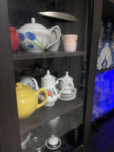 - Витрина: 2 стеклянные двери/створки, внутренние полки под посуду и декор.