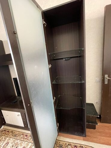 - Правый модуль-витрина: дверь из матового стекла, внутри несколько стеклянных полок.