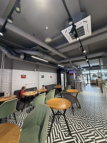 - Современный интерьер: дизайнерская плитка, мягкие кресла и диваны, круглые столы, трековое освещение, приточно‑вытяжная вентиляция и кассетные кондиционеры.