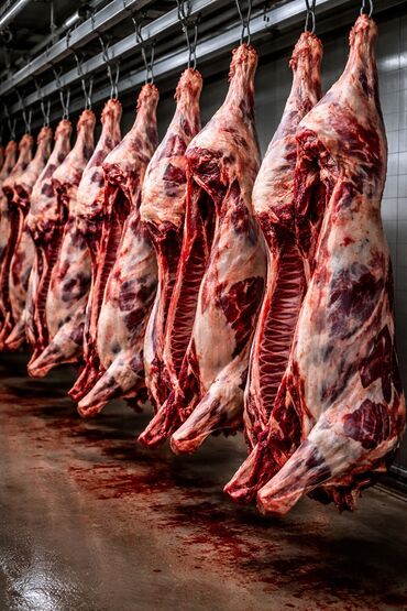 Говяжья туша (задняя/передняя четвертины на подвесе). - Забой и обвалка в цеху, охлаждённая туша на крюке. - Полутуша с выраженными мышечными слоями, подходит для разделки на стейки, жаркое, гуляш...