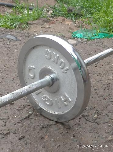 - На каждом конце установлен по одному диску 10 кг (литьё, маркировка «10 KG»). Общий вес с показанными блинами — около 20 кг без учета грифа.