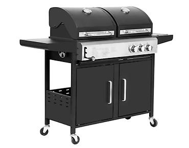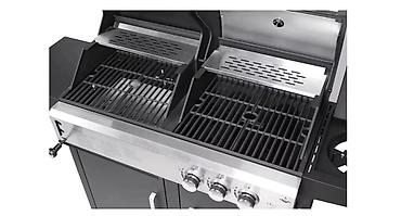 Функциональный газовый гриль имеет в своем арсенале встроенную систему поджига, три трубчатые горелки из нержавеющей стали и чугунные решетки. Дополнительная решетка для подогрева позволит сохранить вашу пищу теплой, а дополнительная горелка, встроенная в боковой столик, позволит приготовить различные соусы. Для удобства перемещения гриль оснащен транспортировочными колесами.