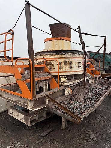 - Вертикальная ударная дробилка (тип роторной VSI) с верхней загрузочной воронкой; кожух с сервисными люками; площадки и ограждения для обслуживания; нижний приводной электродвигатель; разгрузочные лотки по сторонам.