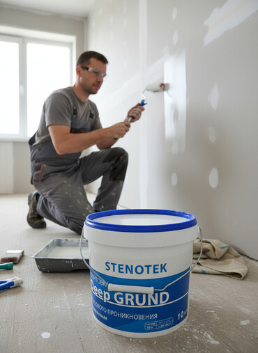 Грунтовка глубокого проникновения Stenotek в белом пластиковом ведре с