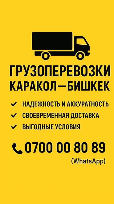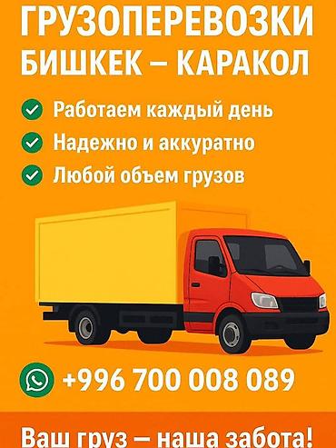 Грузоперевозки Маршруты: - Бишкек — Каракол - Каракол — Бишкек - По городу и районам: Юг-Сеевер, Чолпон-Ата, Бостери, Туп, Боконбай, Кызыл-Суу, Жети-Огуз Что перевозим: - Стройматериалы - Мебель...