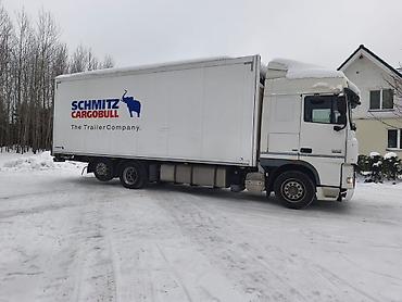 Грузовой автомобиль DAF XF белого цвета в сцепке с прицепом-фургоном Schmitz Cargobull. Автомобиль имеет кабину со спальным местом, что подходит для дальних перевозок. Прицеп-фургон оборудован распашными задними дверями для удобства погрузки и разгрузки. Комплекс предназначен для транспортировки различных грузов, требующих защиты от внешних воздействий.