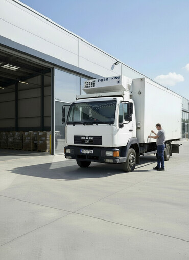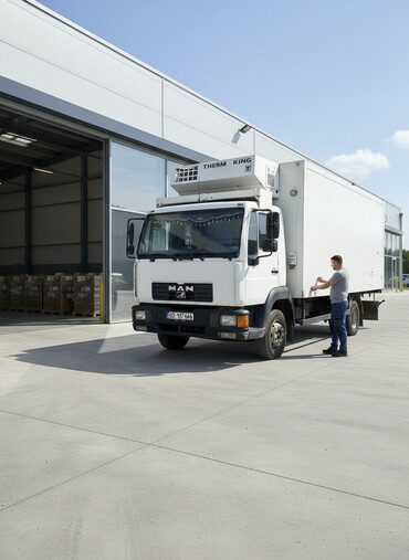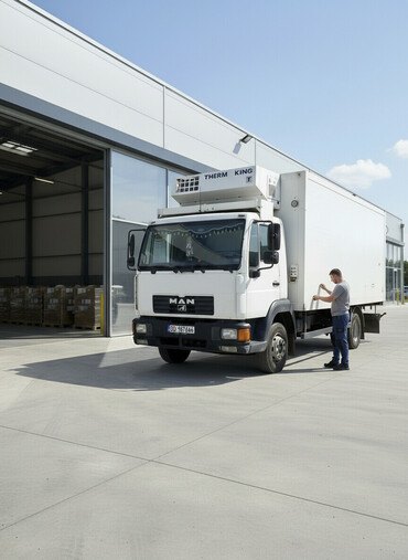 Грузовик-рефрижератор белого цвета, оснащенный холодильной установкой Thermo King. Кабина грузовика имеет стандартную конфигурацию с двумя дверями и боковыми зеркалами. Этот автомобиль подходит для транспортировки товаров, требующих поддержания определенного температурного режима, таких как продукты питания или медикаменты.