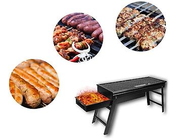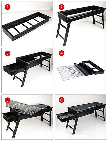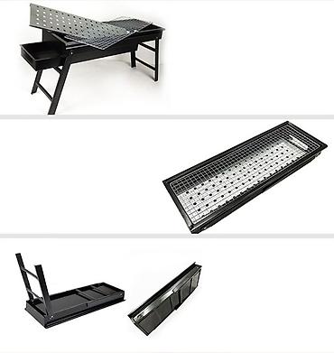 - Конструкция: прямоугольный мангал на устойчивых ножках, с длинной жаровой зоной.