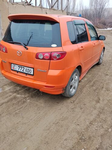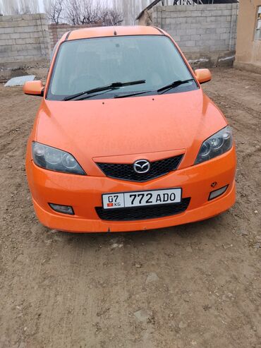 Mazda Demio (хэтчбек), правый руль. Яркий оранжевый цвет кузова, 5 дверей, легкосплавные диски, накладка-спойлер на двери багажника, тонкие ветровики на окнах. Передняя и задняя оптика в заводском стиле, противотуманные фары в переднем бампере. Номерные знаки KG на авто.