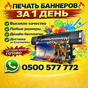 Печать баннеров, лайтбоксов и вывесок. - Стартовая цена: от 250 сом (указано на макетах; также есть тариф 250 сом/м²) - Быстро: изготовление за 1 день (по информации на баннере) - Качественно, над...