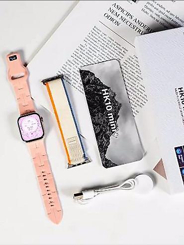Комплектация на фото: часы HK10 mini, дополнительный ремешок, магнитная зарядка, документация, фирменная коробка. Цвета корпусов/ремешков на изображениях: бежевый, розовый, черный плетёный ремешок.
