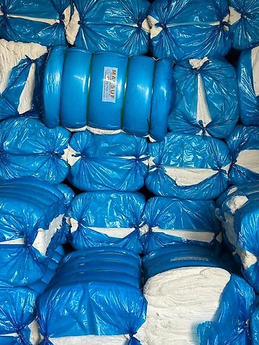 - Форма поставки: прессованные тюки/мотки, стянутые лентами; часть упакована в плотные синие полиэтиленовые мешки.