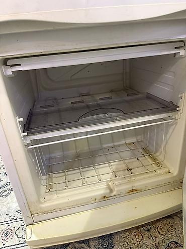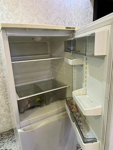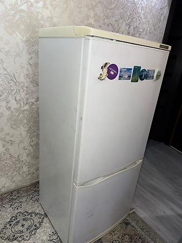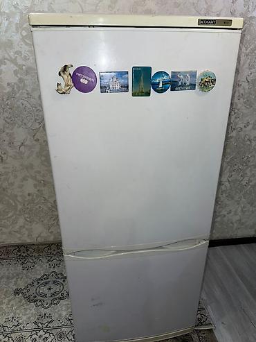 Внешне на корпусе видны следы эксплуатации и пожелтение пластика; на дверце есть наклейки/магниты. Внутри комплектность показана на фото. Маркировка бренда «АТЛАНТ» на верхней кромке двери.