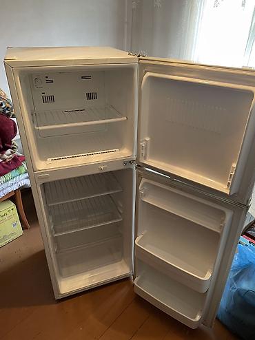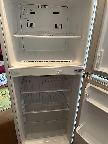 - Компоновка: 3 проволочные полки в холодильной камере, ящик для овощей/фруктов, полки на двери; в морозильной камере — полка-решётка и полка на двери.