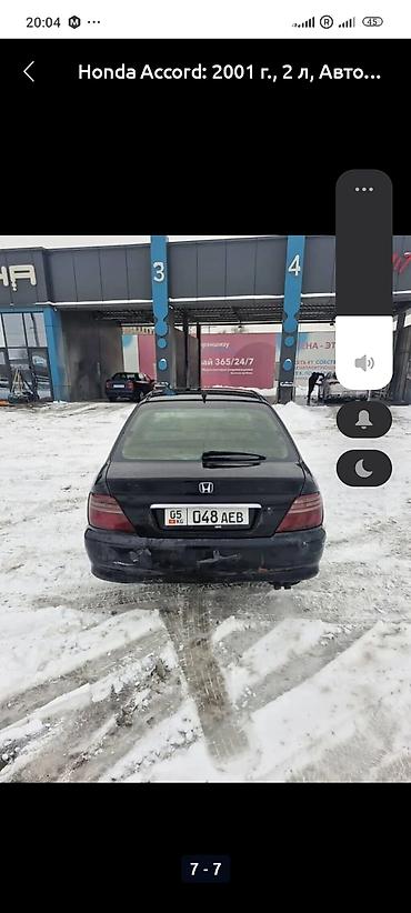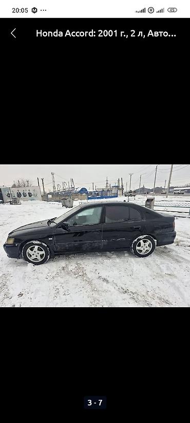 Honda Accord, 2001 год выпуска. Седан, черный цвет. Двигатель 2.0 л, автоматическая коробка передач. Привод передний. Легкосплавные диски, тонированные стекла. Салон с чехлами на сиденьях, мультируль, центральная консоль с селектором АКПП, магнитола, кондиционер/печка, подстаканники, прикуриватель, коврики. Электропакет: стеклоподъемники, зеркала. Противотуманные фары, задний дворник. Номерной знак: 05 KG 048 AEB.