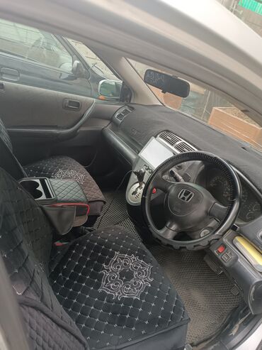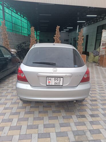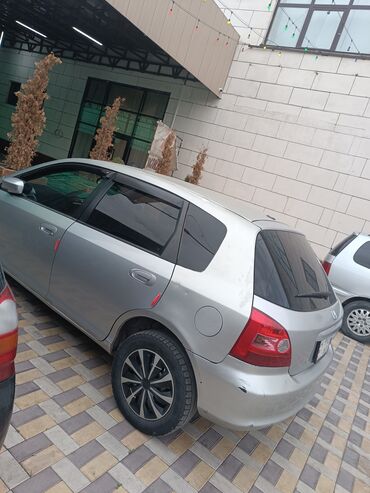 Honda Civic, серебристый хэтчбек (поколение EU/EP). Основные особенности: - Кузов: 5‑дверный хэтчбек, серебристый цвет. - Интерьер: тканевые сиденья с чехлами, задний ряд просторный; передняя пане...