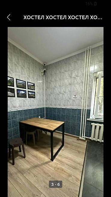 - Комната общего пользования: стол из массива/ЛДСП с металлическими опорами, табуреты, настенные фото, кафельные стены.