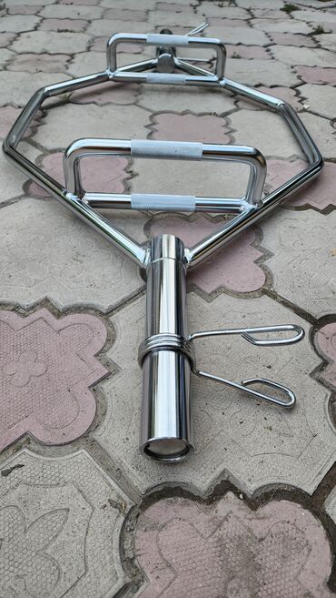 ШтангаТрап-гриф хромированный для тренировок с весом. Оснащен двумя парами рукояток с нескользящей накаткой, что позволяет регулировать хват. Две пары штырей для дисков обеспечивают равномерное распределение нагрузки. В комплект входят фиксаторы для дисков. Предназначен для работы с различными группами мышц, включая трапеции, спину и ноги, а также для выполнения становой тяги.