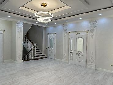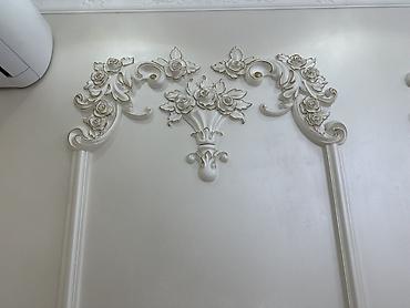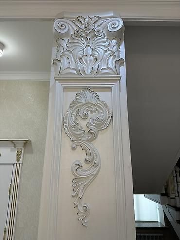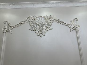 - Потолочная композиция с объёмной лепниной: розетки под люстры с тонкой прорисовкой, угловые и центральные орнаменты, карнизные молдинги по периметру, декоративные вставки и бордюры.