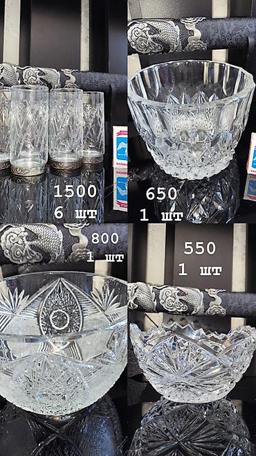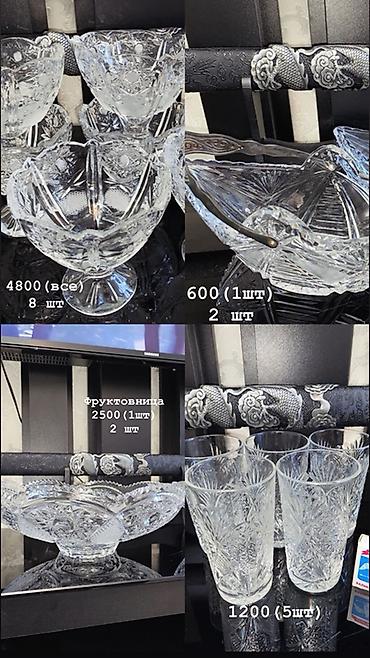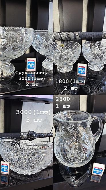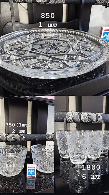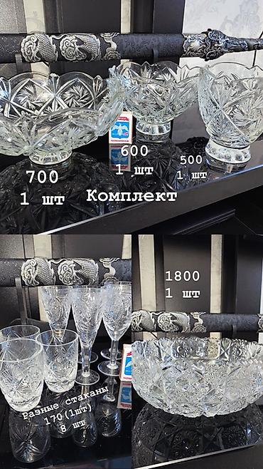 Набор посуды и хрусталя. 1) Большое прессованное/гранёное хрустальное блюдо с богатой резьбой (звезды, rosettes, лепестки). Диаметр крупный, широкие борта с зубчатыми краями. Цена: 8000. 2) Две ...
