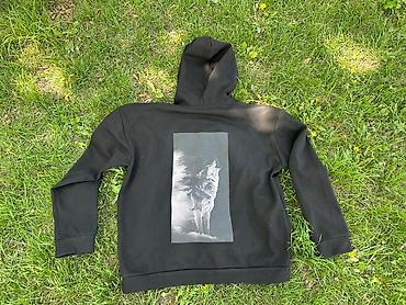 - Принт: крупное графическое изображение волка на спине (монохром, вертикальная вставка)