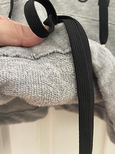 - Укороченный силуэт с кулиской по нижнему краю (длинная чёрная лента для регулировки посадки).