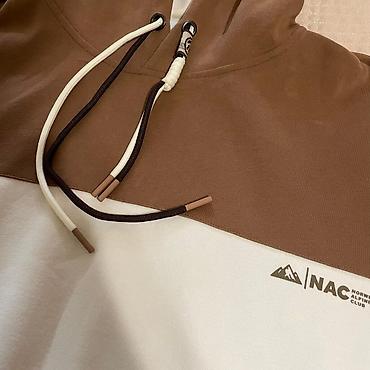 - Дизайн: классическое худи с капюшоном, утягивающиеся шнурки двух цветов с декоративной намоткой; небольшой логотип NAC с горной эмблемой на груди