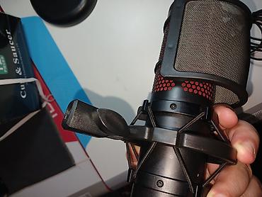 HyperX QuadCast - USB Microphone (Black-Red) - Red Lighting - Полнофункциональный автономный микрофон для стримеров, создателей контента и геймеров, красное свечение, поп фильтр, на подвесах, отключение и включение мирофона по одной кнопке сверху, регулировка чуствительности мирофона снизу, есть разъем три с половиной дюйма миниджек для мониторинга звука через наушники