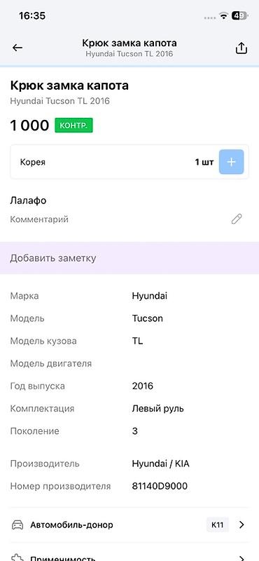 Назначение: элемент механизма запирания капота (крючок/язычок фиксатора), обеспечивает надежную фиксацию капота и корректную работу замка. Подходит для Hyundai Tucson в кузове TL 2016 года (и совместимых модификаций этого поколения).