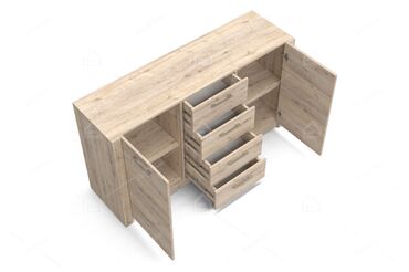 Длинный комод с четырьмя выдвижными ящичками, оснащенными специальными механизмами, которые позволяют их плавно открывать и закрывать, а также двумя шкафчиками, гармонично вписывается в любой дизайн интерьера. Также важной его особенностью является вместительность и практичность.