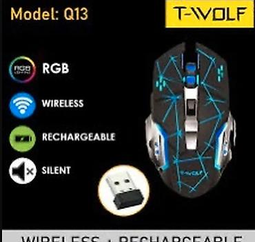 В комплекте: мышь T‑Wolf Q13 и USB‑нано‑приемник. Цветовой акцент — черный с неоновыми линиями и эффектной LED‑подсветкой. Отлично подходит для шутеров, MOBA и повседневных задач.