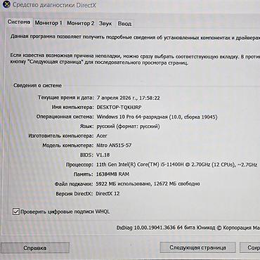 - Процессор: Intel Core i5-11400H (11‑е поколение, 6 ядер/12 потоков, базовая частота ~2.7 ГГц).