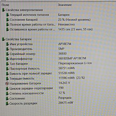 - Батарея: Li‑Ion AP18E7M, паспортная емкость 58 751 mWh, емкость при полной зарядке 51 528 mWh, текущий износ 12%, 199 циклов.
